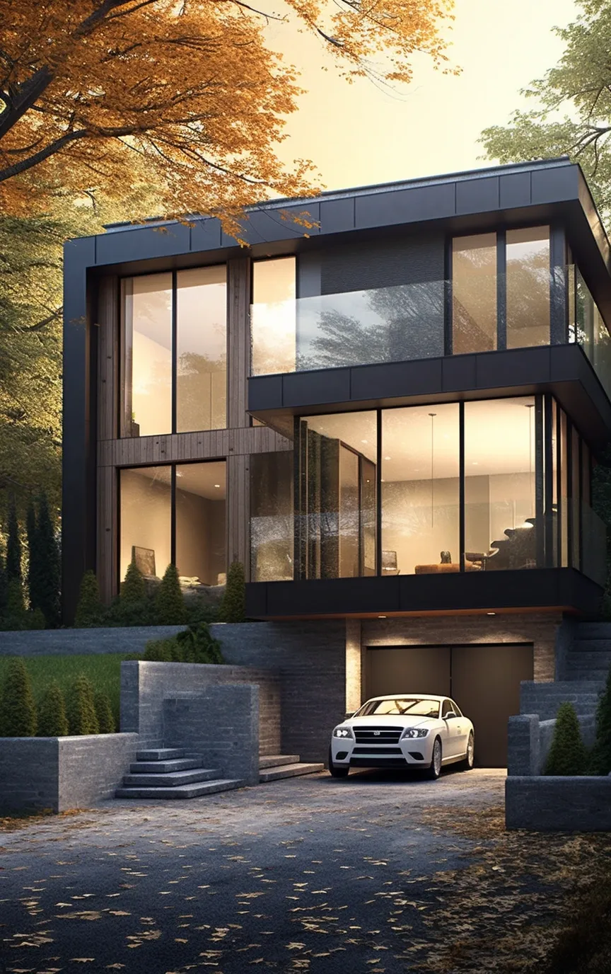 Design a 2500 square foot, single-family home that has 3 bedrooms, a kitchen, living room, dining room, and den, modern building with wonderful natural daylight, geometrical, with simple curves, made with concrete, steel, and glass, where all window frames are mahogany, parametric architecture Grasshopper, in the golden hour time--v 5 --ar 5:8